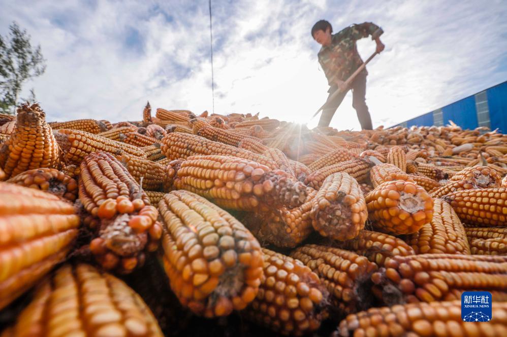 10月19日,河北省遵化市東新莊鎮農民在場院堆放收獲的玉米。