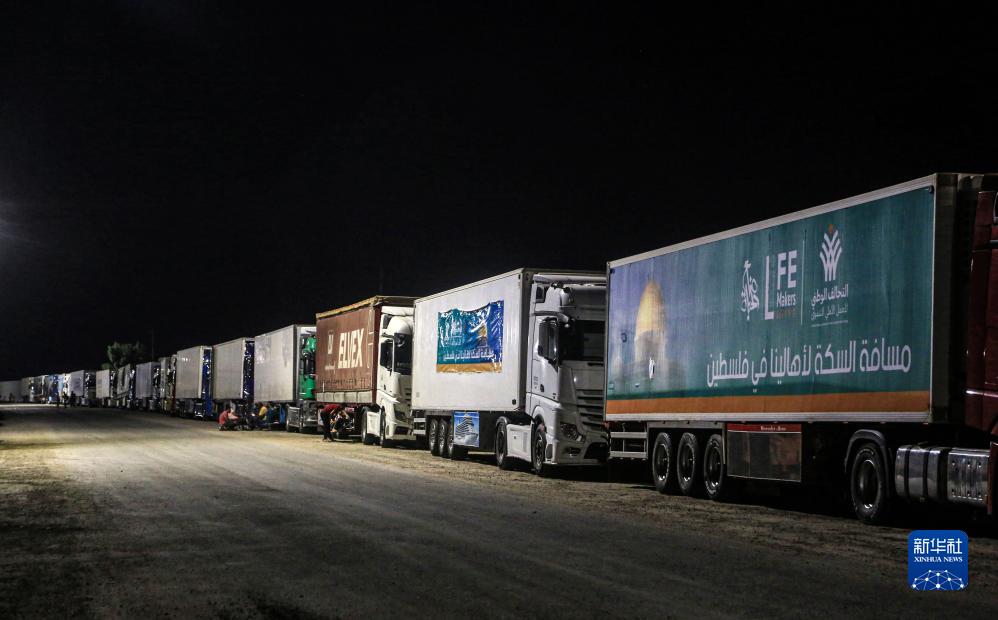 10月19日,在拉法口岸埃及一側,裝載有人道援助物資的貨車在等待拉法口岸開放。