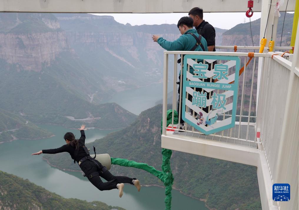 10月19日,游客在河南寶泉旅游度假區體驗懸崖蹦極項目。