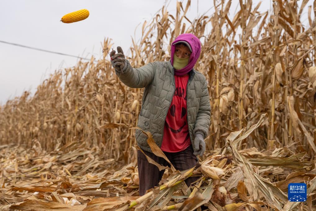 10月18日,在黑龍江省尚志市長壽鄉,農民在玉米地中收獲玉米。