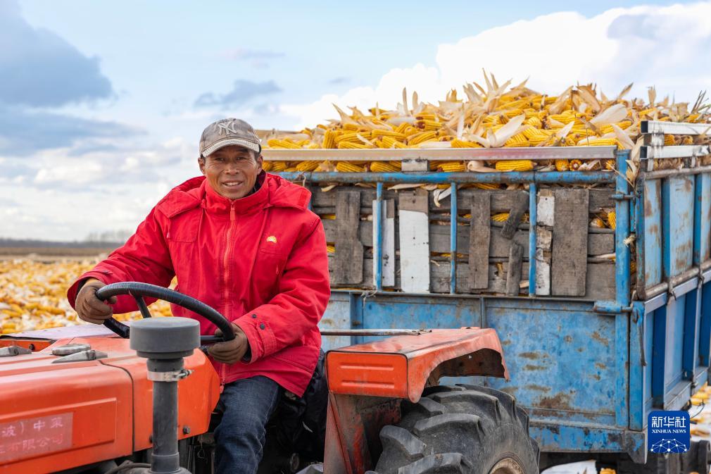 10月19日,在黑龍江省肇東市五里明鎮(zhèn)東升村,農(nóng)民在運(yùn)輸剛收獲的玉米。