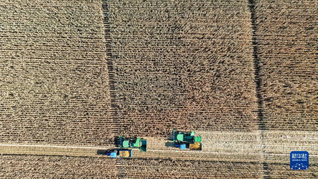 10月19日,在中國科學院“黑土糧倉”科技會戰長春示范區公主嶺示范基地,工作人員駕駛農機收獲玉米(無人機照片)。