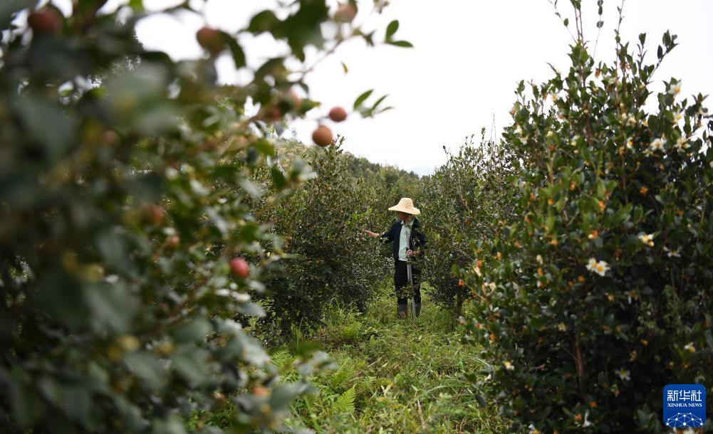 在乳源瑤族自治縣石角塘村的油茶省級現(xiàn)代農(nóng)業(yè)產(chǎn)業(yè)園,工作人員查看油茶果長勢(10月18日攝)。