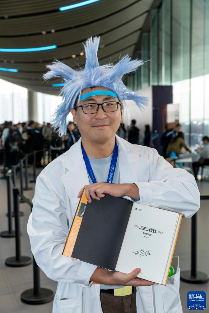 10月20日,一名來自西安的科幻迷展示劉慈欣在《三體》上的簽名。