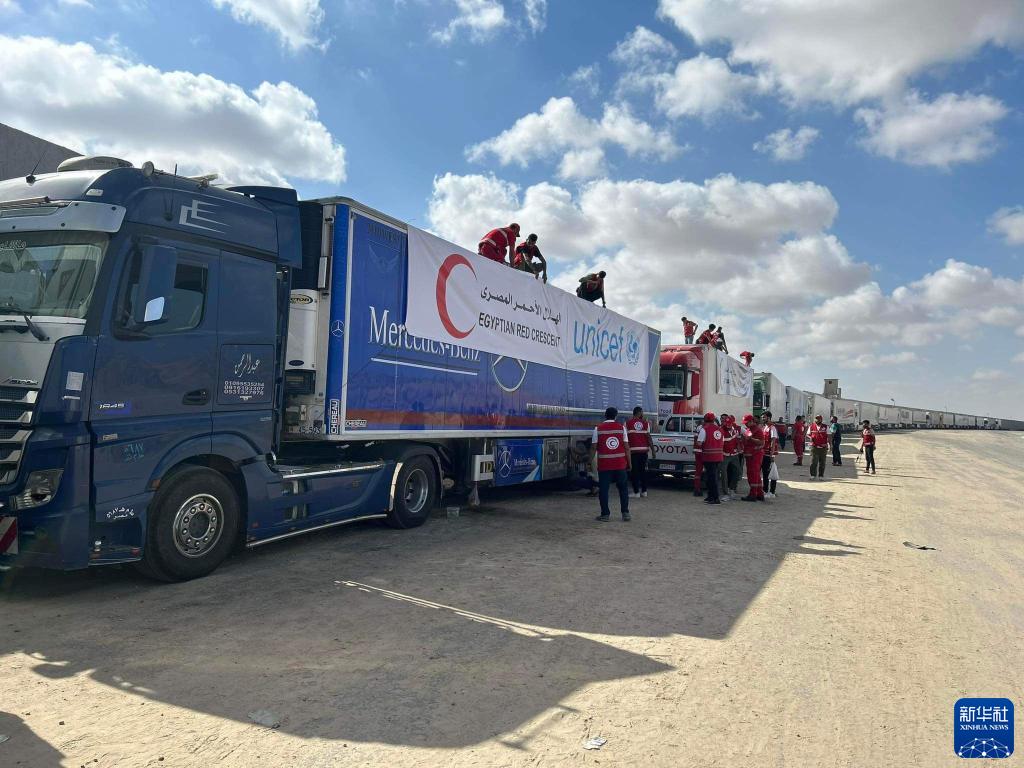 10月20日,在埃及東北部距離拉法口岸45公里的阿里什,埃及紅新月會的工作人員在準備運送援助物資的卡車。