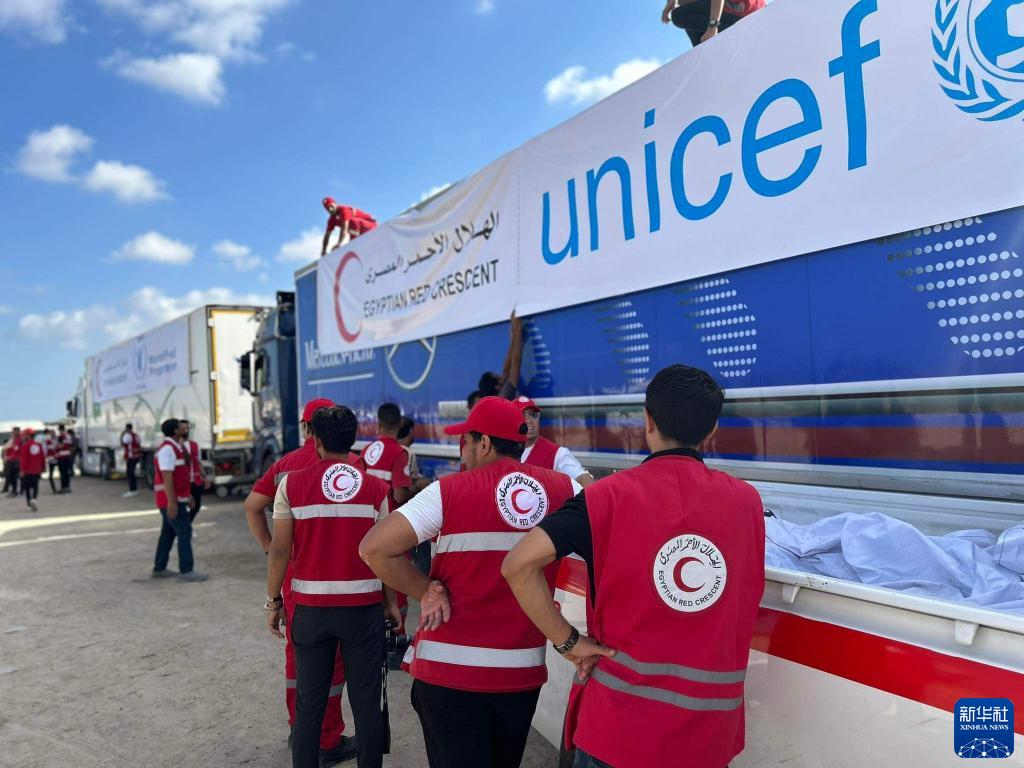 10月20日,在埃及東北部距離拉法口岸45公里的阿里什,埃及紅新月會的工作人員在準備運送援助物資的卡車。