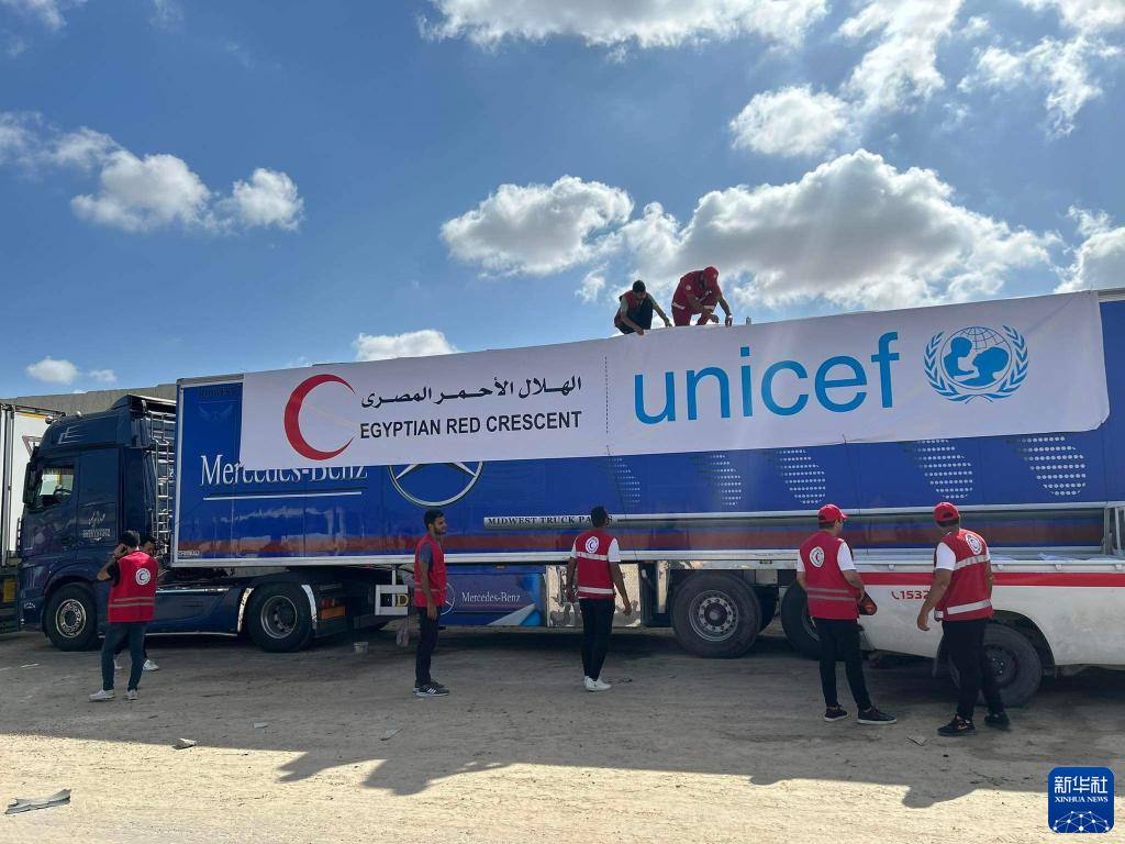 10月20日,在埃及東北部距離拉法口岸45公里的阿里什,埃及紅新月會的工作人員在準備運送援助物資的卡車。
