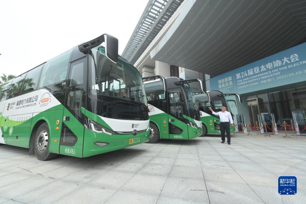10月20日拍攝的在第24屆亞太電協(xié)大會(huì)展覽會(huì)上展示和供參會(huì)者體驗(yàn)的氫能大巴車。