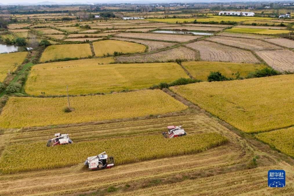 在湖北省天門市石家河鎮(zhèn)唐店村,農(nóng)民操作農(nóng)機收割水稻(無人機照片,10月19日攝)。
