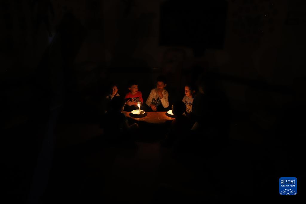 這是10月20日在加沙地帶南部城市汗尤尼斯拍攝的使用蠟燭照明的兒童。