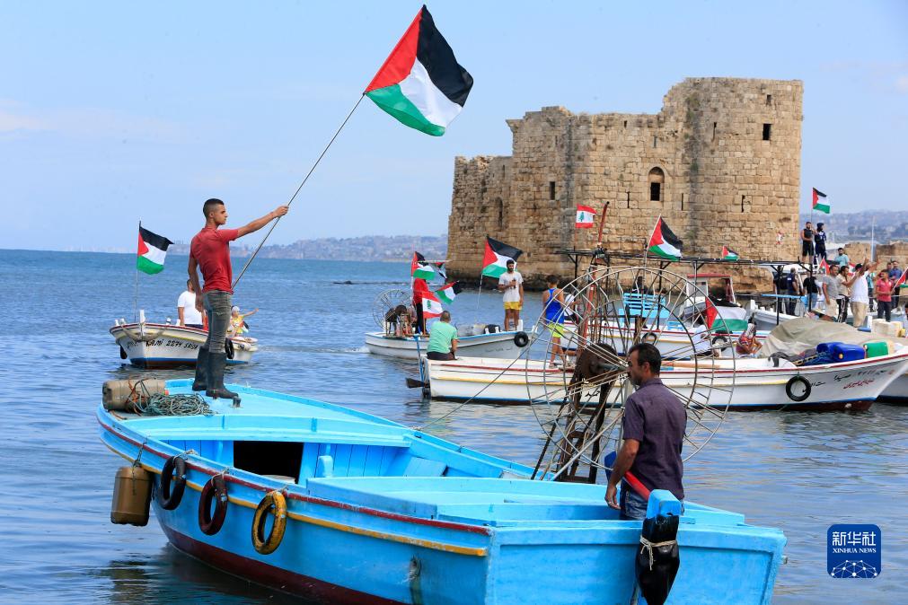10月20日,在黎巴嫩南部西頓,漁民參加水上游行活動。