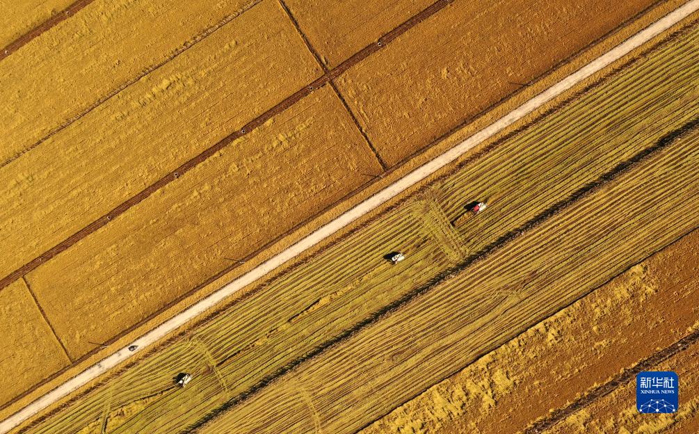 金秋時節(jié),我國水稻主要產(chǎn)區(qū)之一——遼寧省盤錦市遼河三角洲水稻產(chǎn)區(qū)迎來集中收割季,一臺臺農(nóng)機(jī)在田野上收割莊稼,空中俯瞰大片田地滿目金黃。