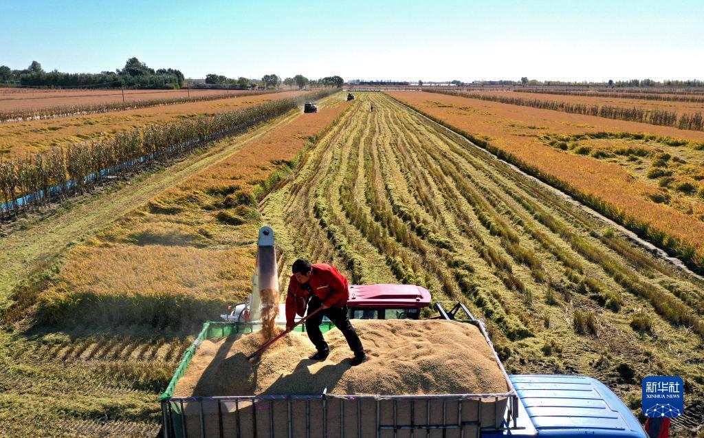 10月20日,一名工人在盤錦市遼河三角洲尤巧元家庭農場的貨車里整理剛剛收割裝運的水稻(無人機照片)。