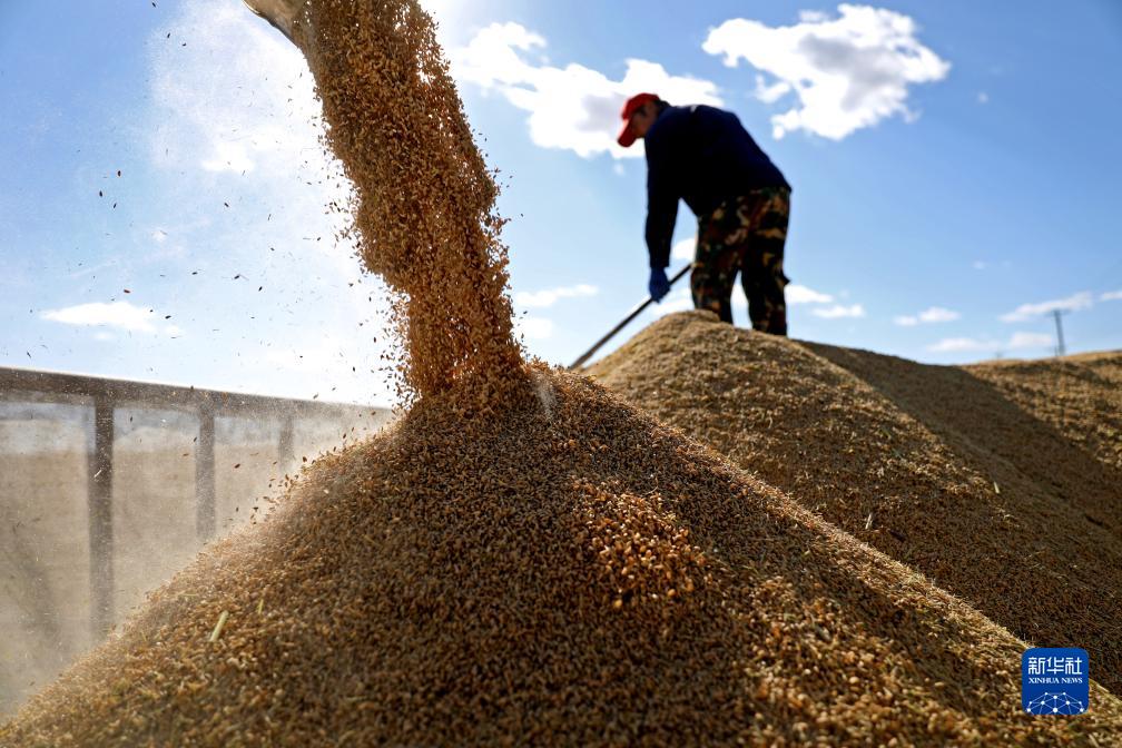 金秋時節(jié),我國水稻主要產(chǎn)區(qū)之一——遼寧省盤錦市遼河三角洲水稻產(chǎn)區(qū)迎來集中收割季,一臺臺農(nóng)機在田野上收割莊稼,空中俯瞰大片田地滿目金黃。