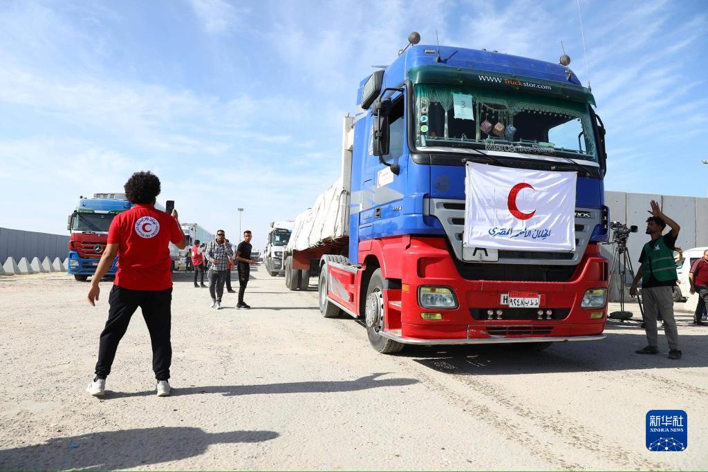 10月21日,在拉法口岸埃及一側,裝載有人道援助物資的貨車準備通過拉法口岸。