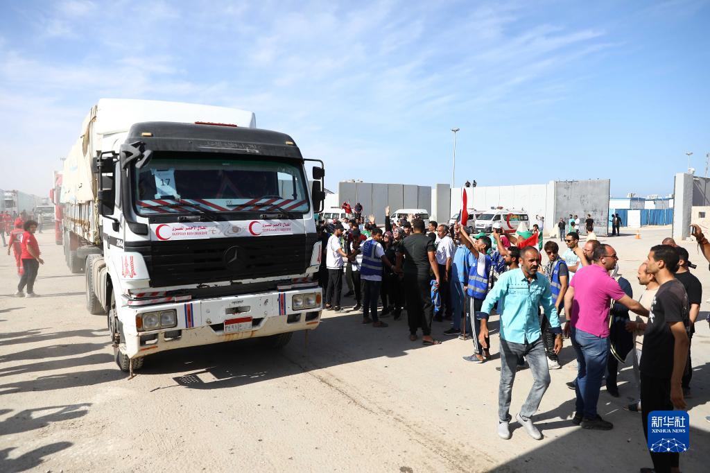 10月21日,在拉法口岸埃及一側,裝載有人道援助物資的貨車準備通過拉法口岸。