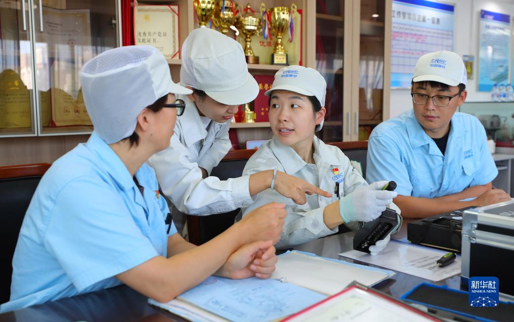在沈陽鐵路信號有限責任公司柯曉賓創新工作室,柯曉賓(右二)和同事探討繼電器調試方法(2022年9月7日攝)。