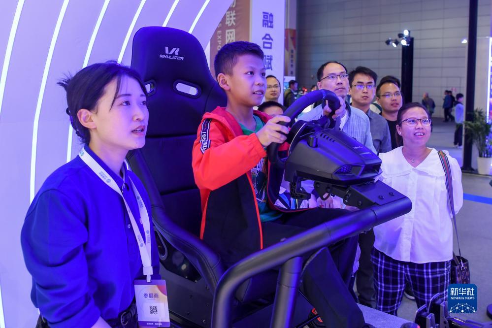 10月21日,小朋友在2023世界物聯網博覽會活動現場體驗智能駕駛。