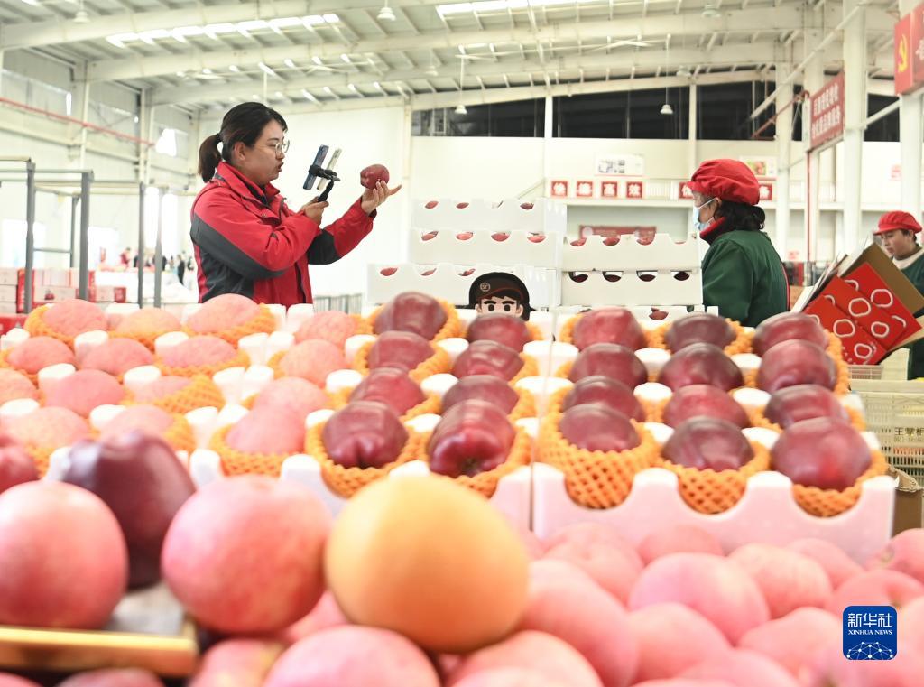 10月20日,工作人員在延安市洛川縣一家果業企業直播帶貨。