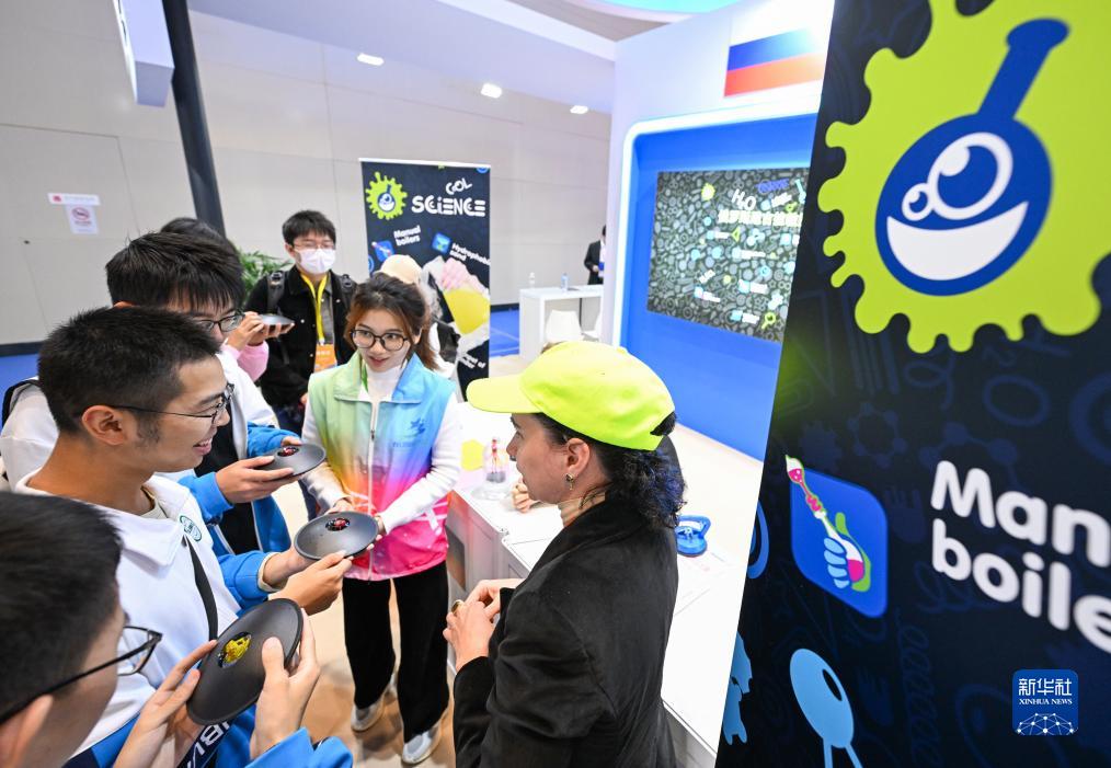 10月20日,學生在俄羅斯展臺與科普人員互動。