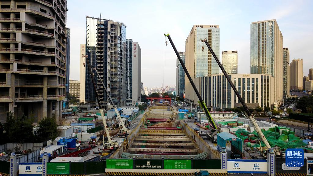 10月21日,在濟(jì)南地鐵6號(hào)線軟件園車站,中鐵四局的工作人員在進(jìn)行車站主體結(jié)構(gòu)施工(無人機(jī)照片)。
