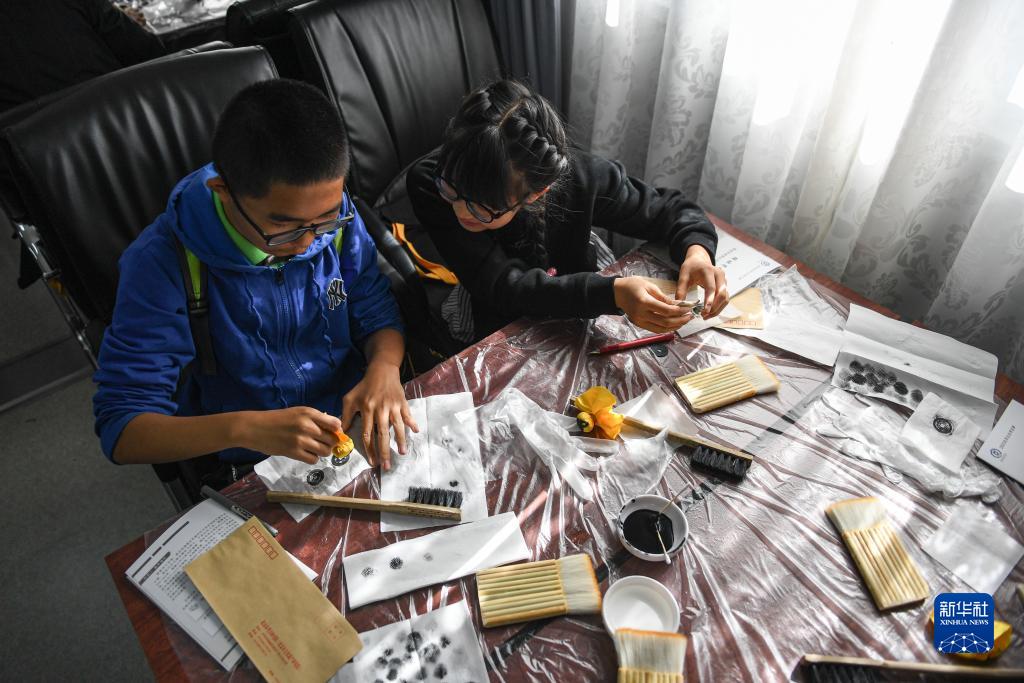 10月21日,小朋友在學習制作銅錢拓片。