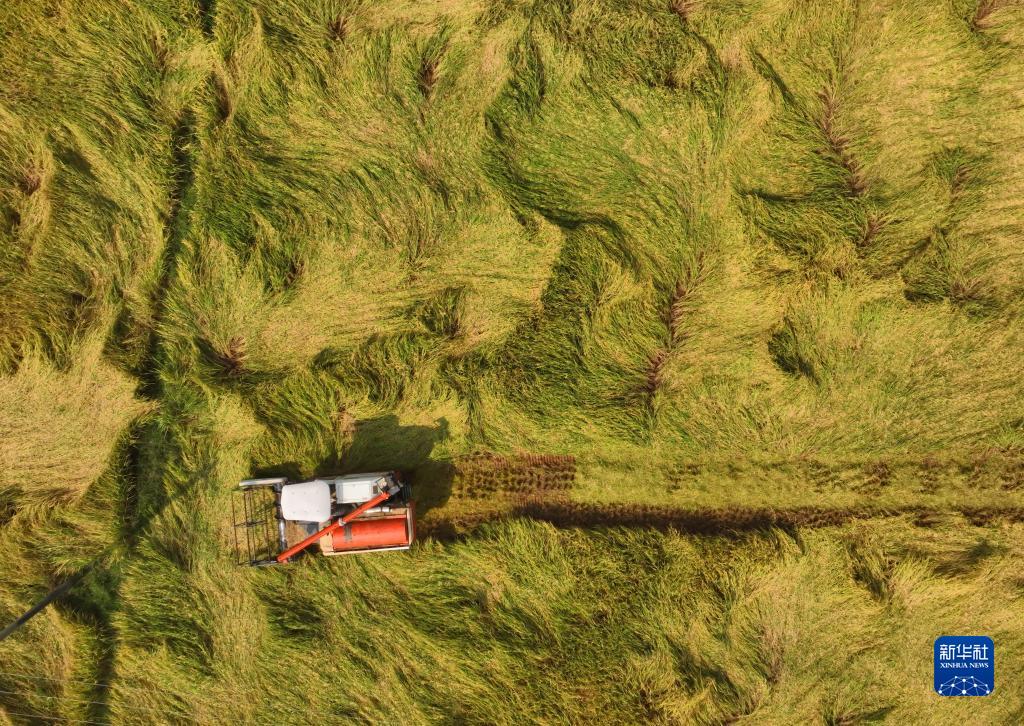 10月21日,在湖南省衡陽(yáng)市祁東縣金橋鎮(zhèn),當(dāng)?shù)卮迕耨{駛農(nóng)機(jī)收割晚稻(無(wú)人機(jī)照片)。