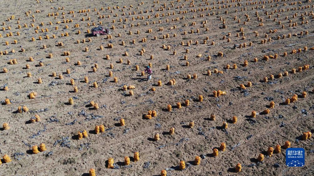 10月21日,農民在甘肅省定西市安定區魯家溝鎮馬鈴薯種植基地收獲馬鈴薯(無人機照片)。
