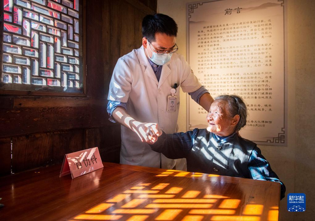 10月21日,浙江省寧波市寧海縣中醫院醫療小分隊隊員在梅林街道河洪村的長壽文化節活動中為老人推拿正骨。