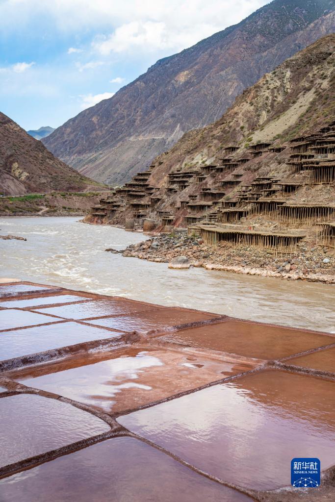 西藏昌都市芒康縣納西民族鄉位于瀾滄江畔,當地從唐代開始制鹽,距今已延續1300余年。鹽田在瀾滄江兩岸依山而建,由多根木柱搭架,架上用透水性強的泥土鋪成平面夯實。當地村民仍保持著原始的手工曬鹽方式,他們從瀾滄江畔的鹽井、鹽池中取出鹵水倒入鹽田,經陽光蒸曬、風干,結晶成鹽。遠遠望去,鹽田錯落有致,景色奇美。