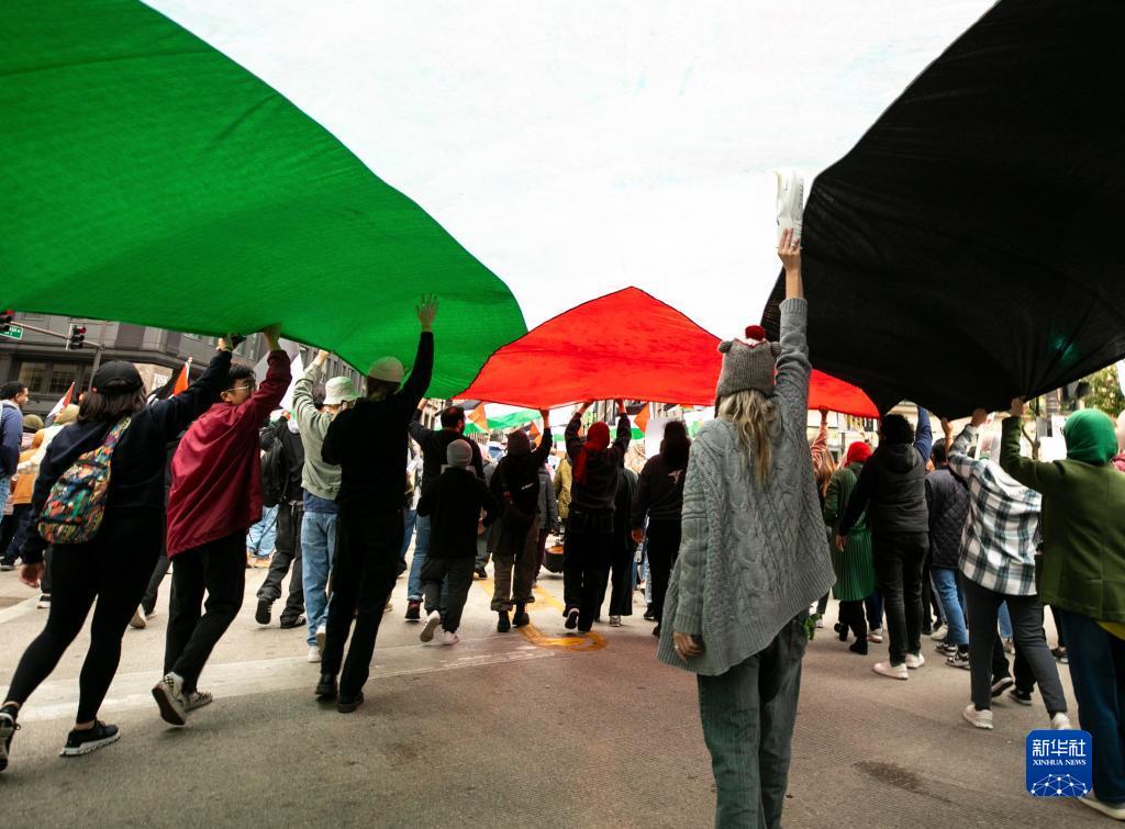 10月21日,在美國芝加哥,人們參加聲援巴勒斯坦的游行。