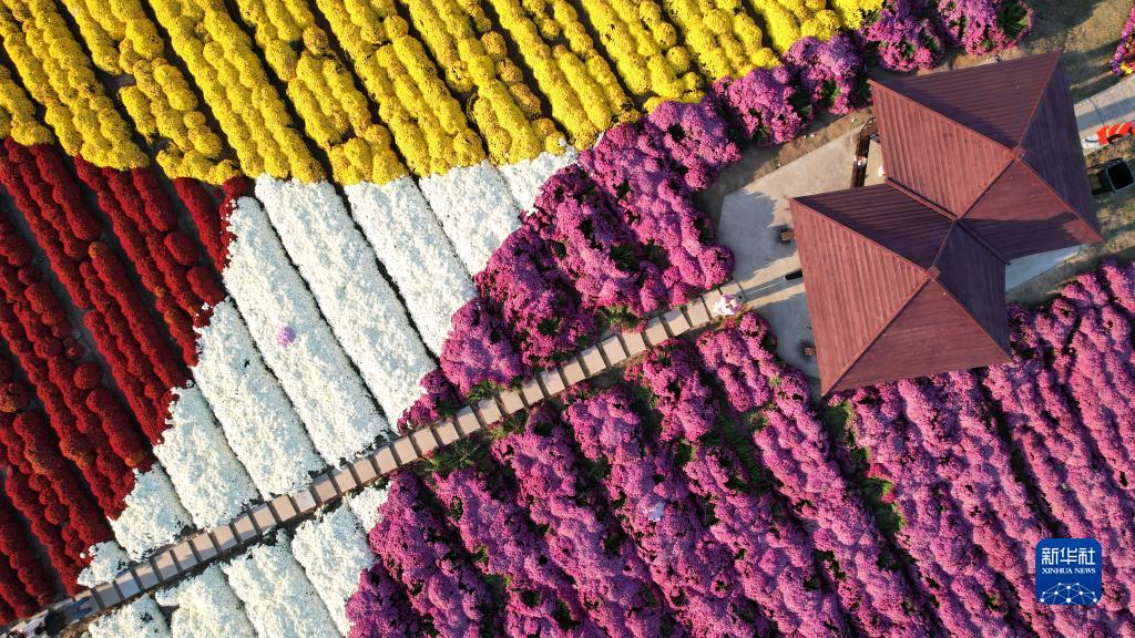這是10月21日在江蘇射陽縣洋馬鎮(zhèn)拍攝的第二十八屆洋馬菊花節(jié)現(xiàn)場(無人機(jī)照片)。