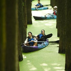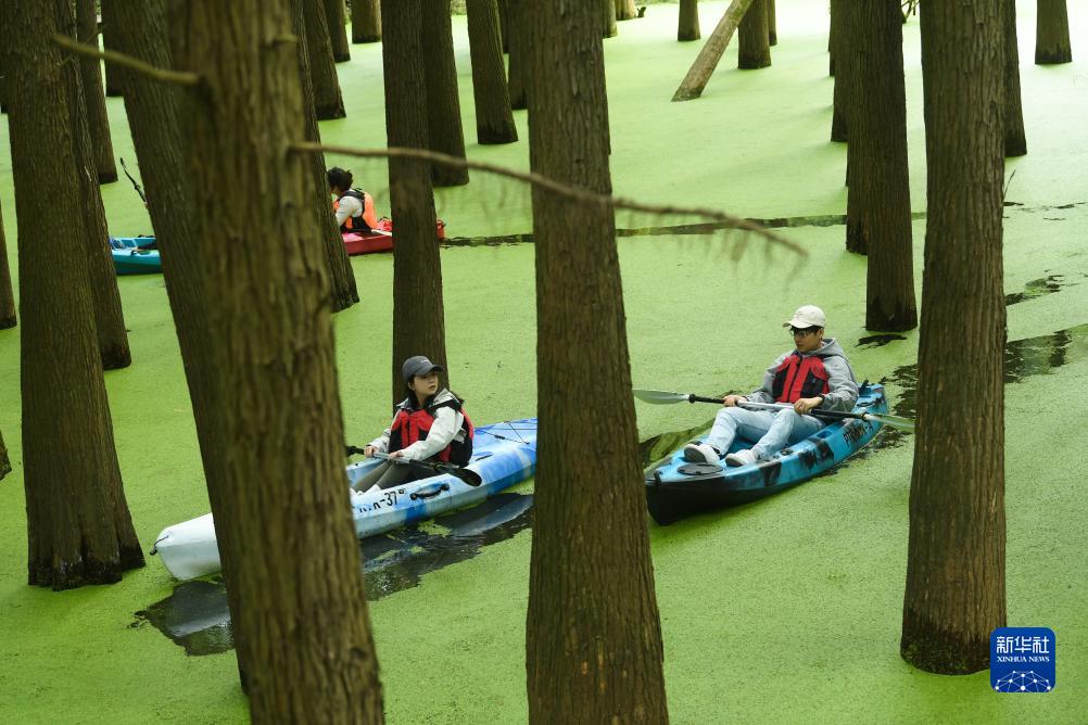 10月22日,游客在杉樹林間泛舟。