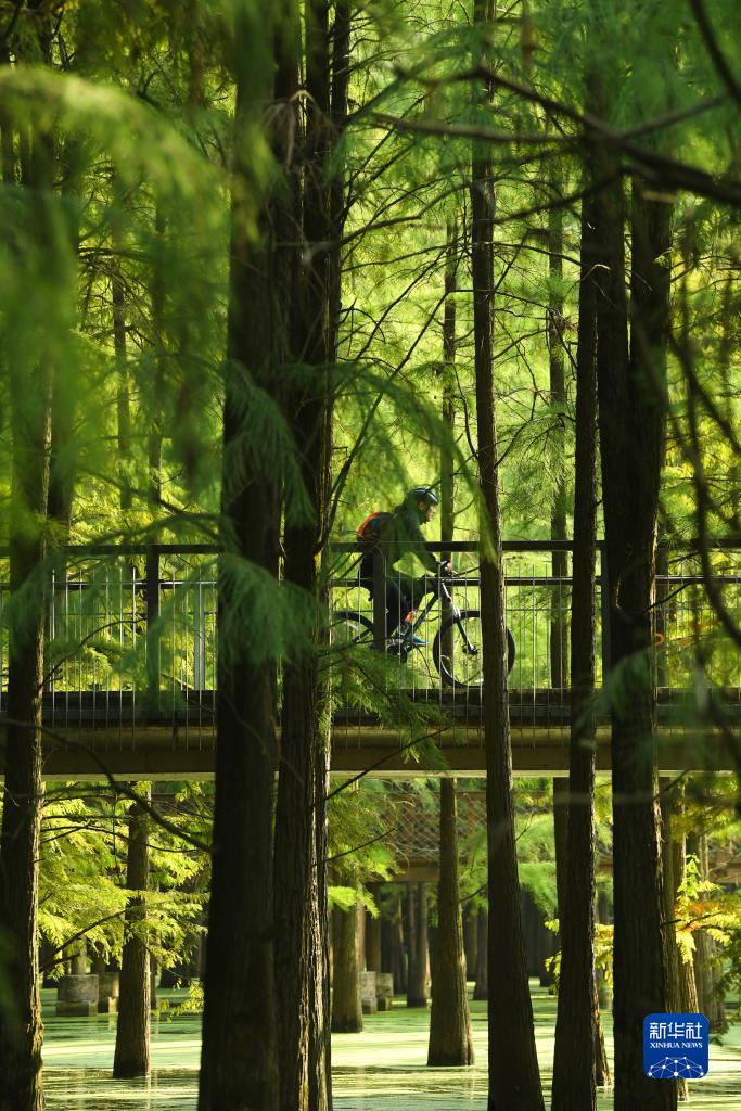 金秋時節(jié),浙江杭州臨安青山湖近百畝池杉和落羽杉混交林呈現(xiàn)“抹茶森林”景觀,引得大批游客前來泛舟、漫步觀光。這片浸沒于水中的森林每到秋季就會鋪滿浮萍,浪漫景觀宛如“綠野仙蹤”。