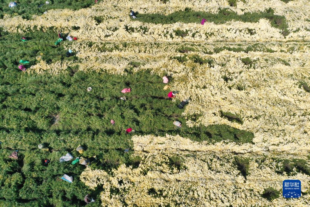 10月22日,臨西縣西張堤村菊花種植戶在采摘菊花(無人機照片)。