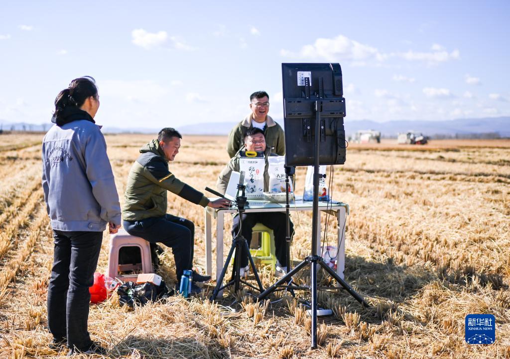 10月20日,劉春艷在琿春市三家子滿族鄉東崗子村的水稻田里查看直播銷售情況。