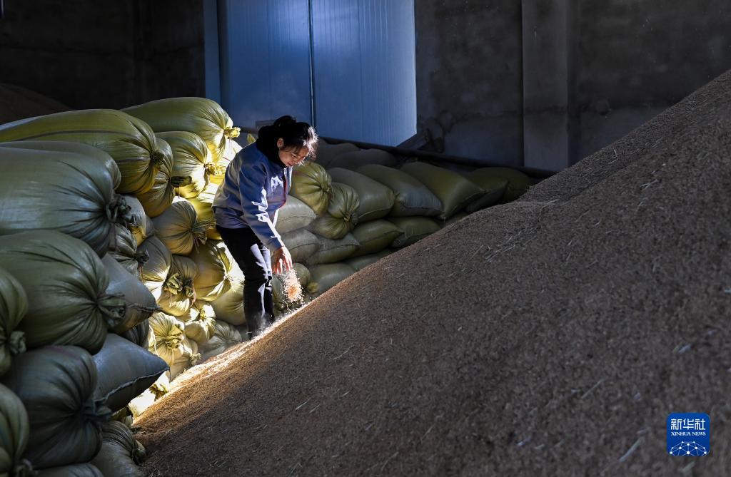 10月20日,劉春艷在自己農場的糧倉內查看水稻稻谷。