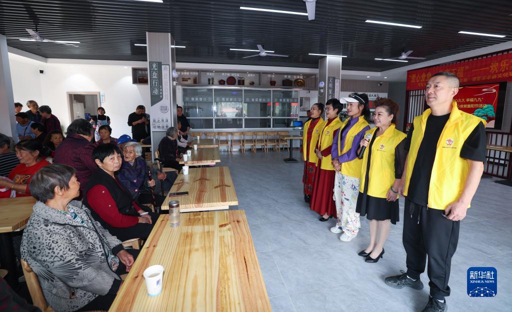 10月22日,在諸暨市楓橋鎮(zhèn)永安社區(qū)愛心食堂,志愿者在給老人們表演節(jié)目。