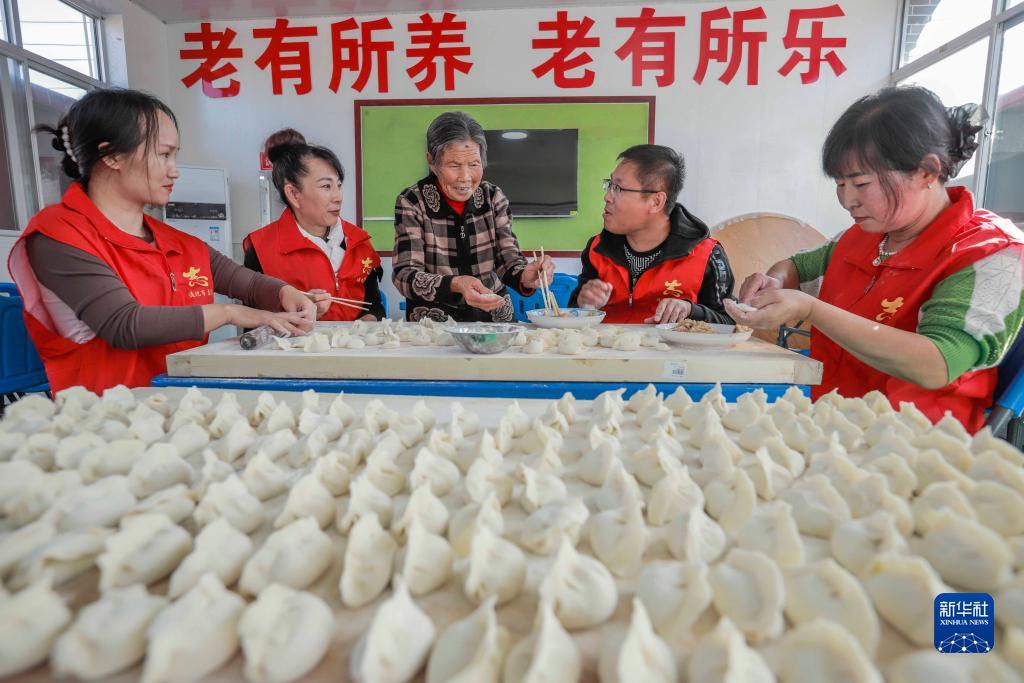 10月22日,志愿者在河北省遵化市東陵滿族鄉(xiāng)互助幸福院與老人一起包餃子。