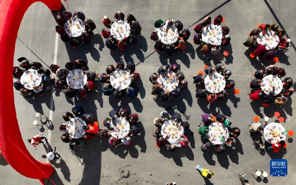 10月22日,河南省濟源市軹城鎮良安新村的老人在享用“萬壽宴”(無人機照片)。