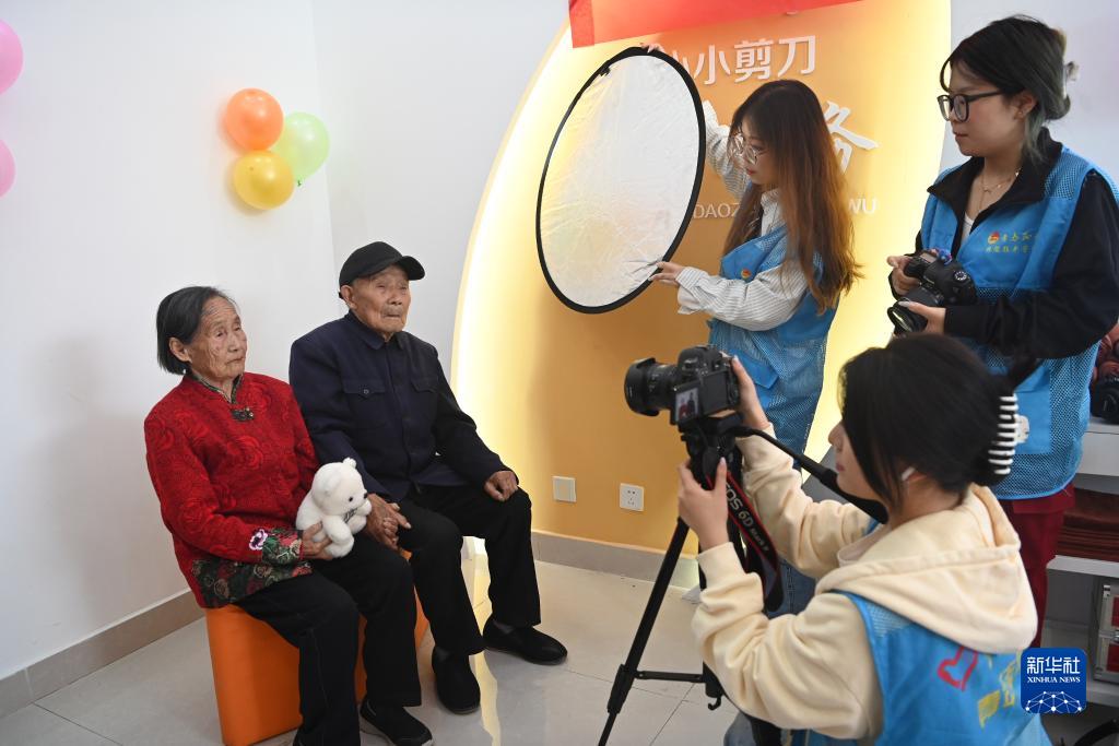 10月22日,在山東省聊城市東昌府區閆寺街道鎮南新村,聊城大學傳媒技術學院大學生志愿者為89歲的秦保平(左二)和88歲的石玉香(左一)拍攝“結婚照”。
