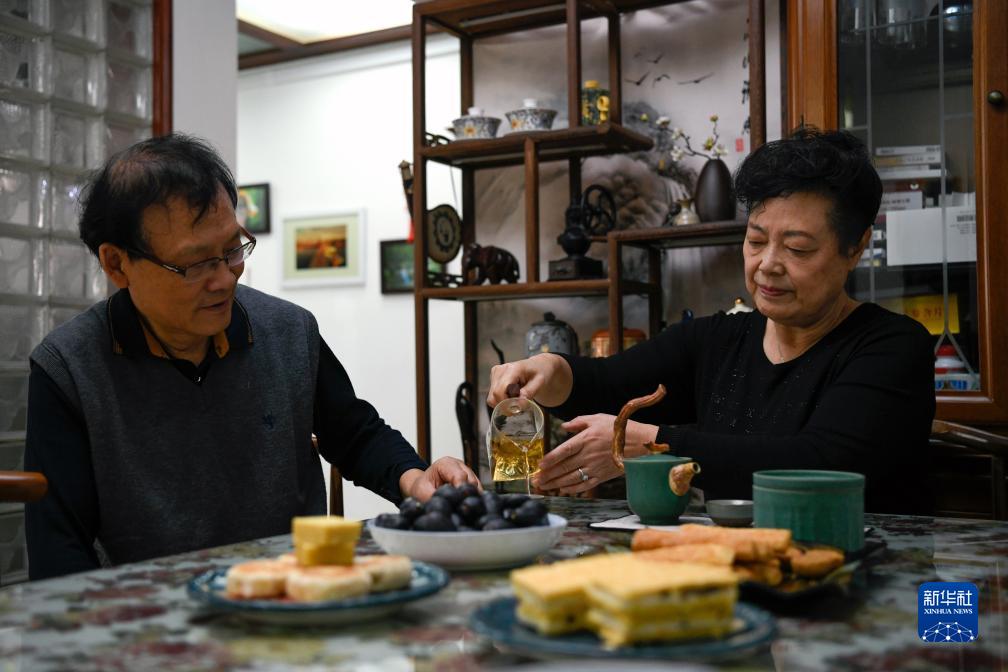 10月21日,鄭義華(右)和丈夫李永東在家喝茶。