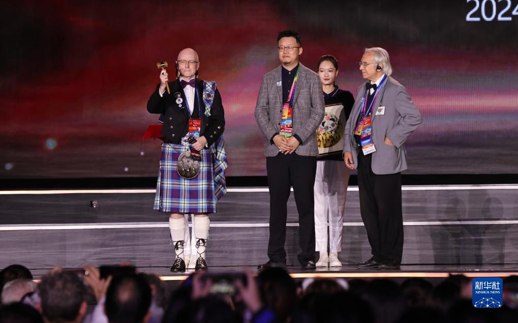 10月22日晚,在第81屆世界科幻大會閉幕式上,2023成都世界科幻大會聯合主席陳石(前中)將世界科幻大會“法槌”交與2024格拉斯哥世界科幻大會代表文森特·多切蒂(前左)。