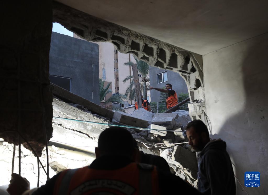 10月22日,在加沙城,人們在遭以色列襲擊損毀的建筑中實(shí)施救援。