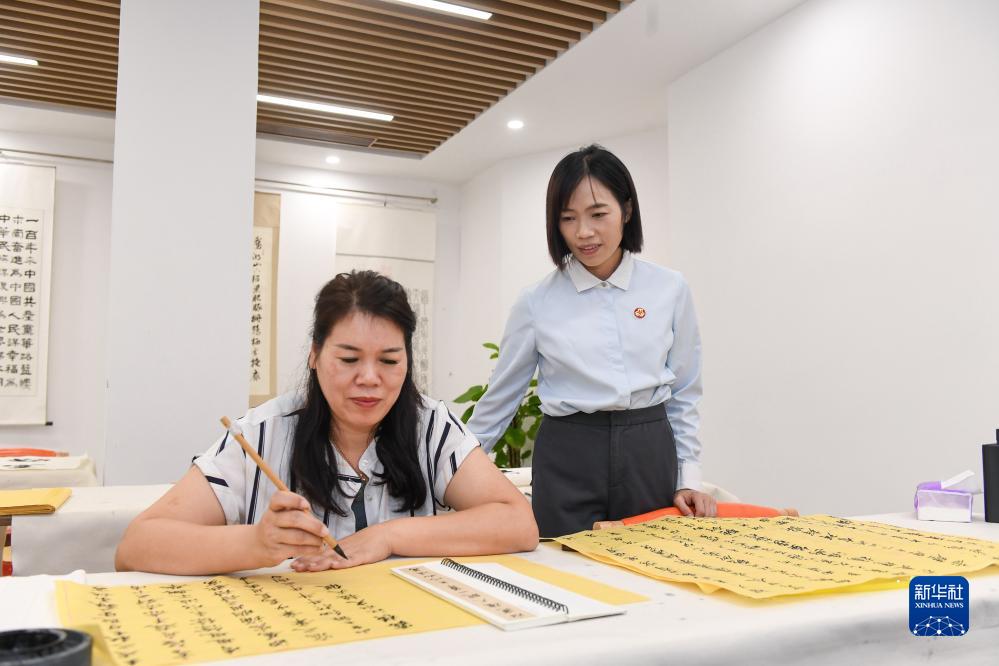 陸秀興(右)在古灶村黨群服務中心的書法室觀看居民練習書法(10月17日攝)。