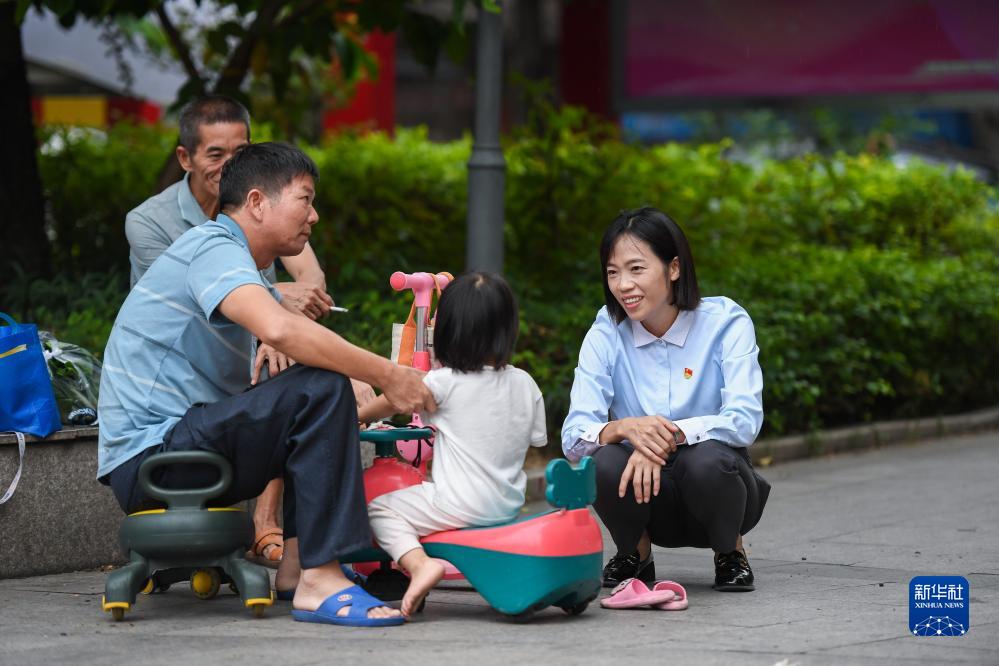 陸秀興(右)在古灶村里與居民聊天(10月17日攝)。