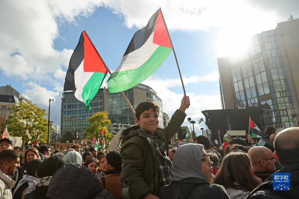 當日,眾多巴勒斯坦支持者在位于比利時布魯塞爾的歐盟總部附近舉行集會,聲援巴勒斯坦。