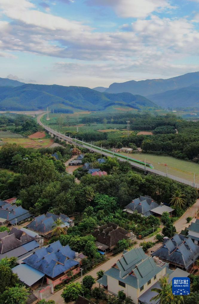 10月18日,在云南省景洪市勐罕鎮,中老鐵路上的動車從傣族村寨旁駛過(無人機照片)。