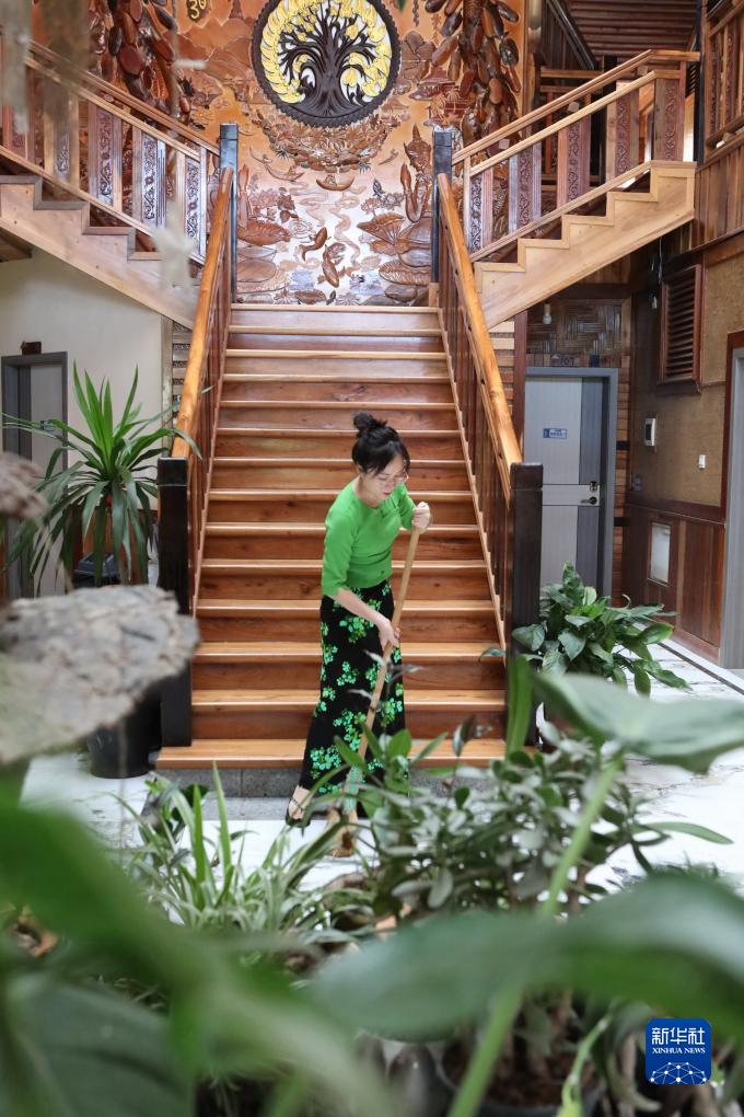 10月18日,云南省景洪市勐罕鎮(zhèn)曼聽村傣族姑娘玉叫囡在自家客棧打掃衛(wèi)生。