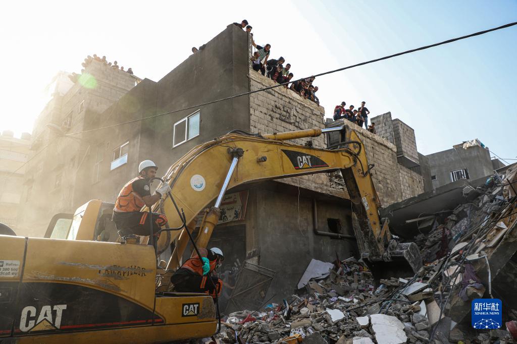 10月22日,人們在加沙地帶南部城市汗尤尼斯遭以色列空襲損毀的建筑中實(shí)施救援。